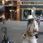 Jazz music from musician Seven playing as people are entering Market Square.